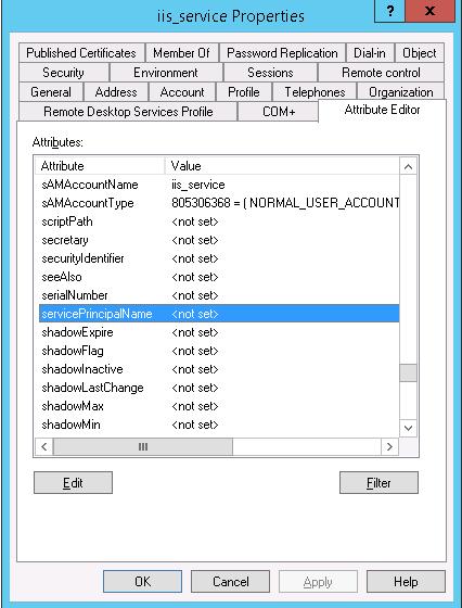 Create a domain account iis_service. Make sure that SPN entries are not assigned for this object (servicePrincipalName attribute is empty).