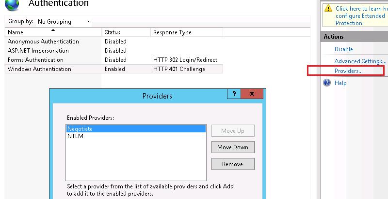 Open the list of providers, available for Windows authentication (Providers). By default, two providers are available: Negotiate and NTLM. Negotiate is a container that uses Kerberos as the first authentication method, and if the authentication fails, NTLM is used. It is required that Negotiate comes first in the list of providers.