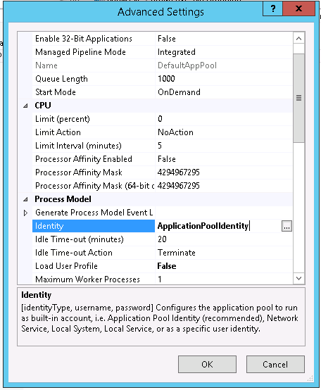 setspn –xThe next step is the configuration of IIS Application Pool to launch it from the account created earlier.