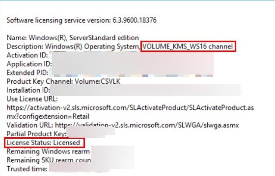 If the KMS host activation has been successful, you will see the values VOLUME_KMS_WS16 channel and License Status: Licensed.