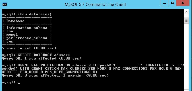 mysql>GRANT ALL PRIVILEGES ON aduser.* TO posh@'10.1.1.195' IDENTIFIED BY 'P@ssw0rd' WITH GRANT OPTION MAX_QUERIES_PER_HOUR 0 MAX_CONNECTIONS_PER_HOUR 0 MAX_UPDATES_PER_HOUR 0 MAX_USER_CONNECTIONS 0;