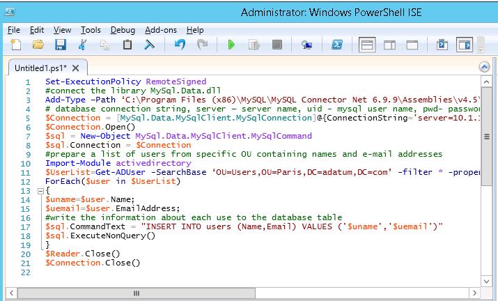 Go back to the server, from which we’ll connect to the MySQL database. Suppose, we want all names and e-mail addresses of the AD users to be shown in the table. You can get this information using Get-ADUser cmdlet.