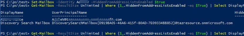 Get-Mailbox -ResultSize Unlimited | Where {$_.HiddenFromAddressListsEnabled -eq $True} | Select DisplayName,UserPrincipalName, HiddenFromAddressListsEnabled