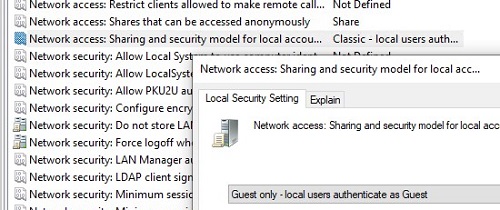 - Go to the following GPO section: Computer Configuration -> Windows Settings -> Security Settings -> Local Policies -> Security Options. Change the value of Network access: Sharing and security model for local accounts parameter from Classic to Guest Only. This policy enables the automatic use of the Guest account when you access a remote computer on the network using a local account (It is assumed that you are logged into Windows with a local account);