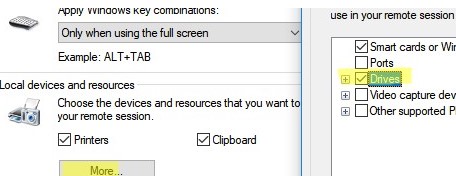 If you want to allow files to be copied via the RDP clipboard, click the More button and check the Drives option. This will allow the use of local drives in the RDP session for file copying tasks.