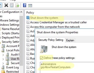 grpAllowRestartComputers) and the built-inAdministratorsgroup; - Update the GPO settings on the target computers and check the resulting GPO settings with the