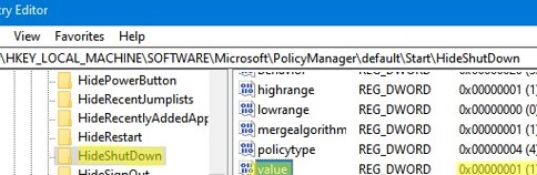REG ADD "HKLM\SOFTWARE\Microsoft\PolicyManager\default\Start\HideShutDown" /v "value" /t REG_DWORD /d 1 /f