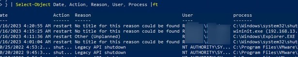 } | Select-Object Date, Action, Reason, User, Process |ft