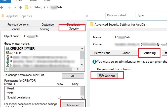 If the message “You must be an administrator or have been given the appropriate privileges to view the audit properties of this object” appears, click the Continue button.