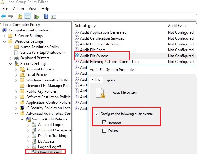 - Open the Audit File System policy and specify that you want to log only successful access events to file system objects (Configure the following audit events -> Success);You can also enable auditing of local objects access using the Audit Object Access policy under Windows Settings -> Security Settings -> Local Policy -> Audit Policy. However, using the File System Audit policy is preferable because it only tracks NTFS access events.