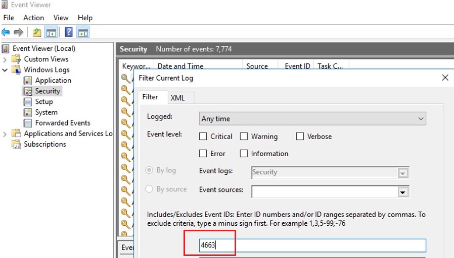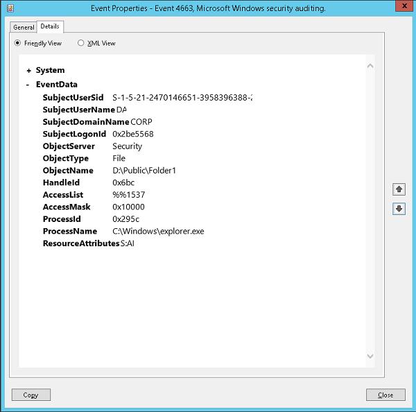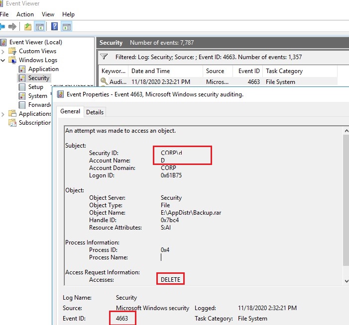 Now, if the user deletes any file or folder in the shared network folder, the File System -> Audit Success file delete event appears in the Security log with Event ID 4663 from the Microsoft Windows security auditing source.