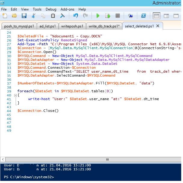 The next PowerShell script will write the data you get to the MySQL database on a remote server (with the IP address 10.1.1.13):