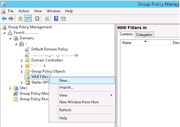 - Open GPMC.msc (Group Policy Management) console and find WMI Filters section.