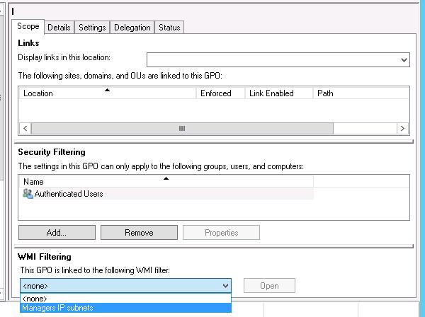 This time it was necessary to apply GPO to computers in the specific IP subnet. In the simplest case, when the subnet is a part of a separate Active Directory site (and this is the only subnet in the site) you can assign your GPO to the AD site. It is a simple and easy method. In our case, we can’t apply the policy to the whole AD site since several IP subnets is bound to it. We’ll have to use the feature of filtering policies using WMI filters.