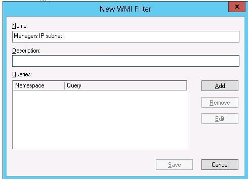 Earlier we have considered using WMI filters to apply the specific Group Policy only to the certain Windows versions. In this case, in the same way you have to create a WMI filter and change the query so that it contains the condition to check IP addresses.