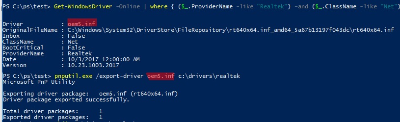pnputil.exe /export-driver oem5.inf c:\drivers\realtek
