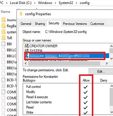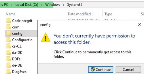 What it looks like: let’s try to open a system folder C:\Windows\System32\Config in File Explorer. User Account Control window appears to warn that you don’t currently have permission to access this folder: