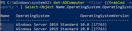 Get-ADComputer -Filter {(Enabled -eq $True) -and (OperatingSystem -Like '*Windows Server*')} -Property * | Select-Object Name,OperatingSystem,OperatingSystemVersion