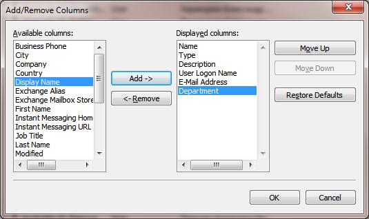 - Add the columns you want. We have added 3 additional fields: User Logon Name, E-Mail Address, Department;