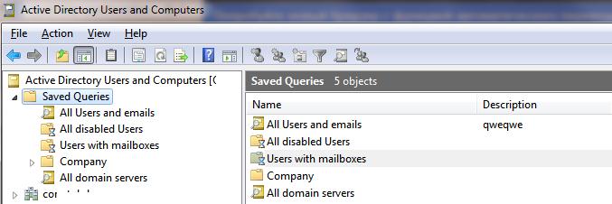 The Saved Queries in Active Directory Users and Computers (ADUC) mmc console allow you to create complex LDAP filters to select Active Directory objects. These queries can be saved, edited and copied to other computers. You can use the Active Directory saved queries for quickly and efficiently find AD objects based on a various criteria. Saved Queries can help you quickly perform common AD object administration tasks: display the list of all disabled accounts in a domain, select all users of a company who have mailboxes on a given Exchange server, etc.