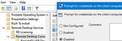 Then navigate to the Computer Configuration -> Policies -> Administrative Templates ->Windows Components ->Remote Desktop Services ->Remote Desktop Connection Client and disable the policy Prompt for credentials on the client computer.
