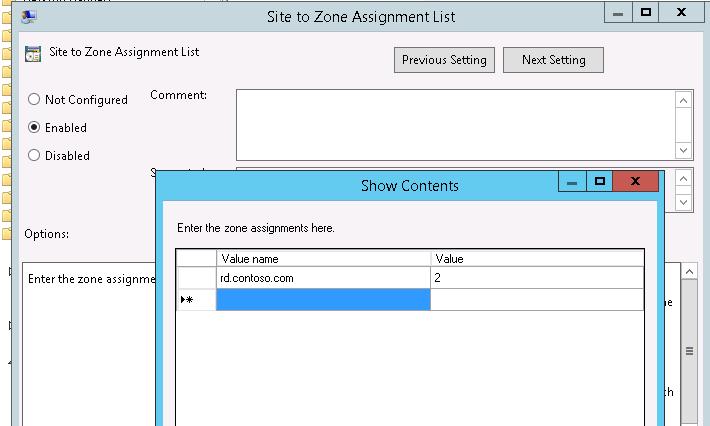 Then, to prevent a window warning that the remote application publisher is untrusted, add the address of the server running the RD Connection Broker role to the trusted zone on the client computers using the policy “Site to Zone Assignment List” (similar to the article How to disable Open File security warning on Windows 10):