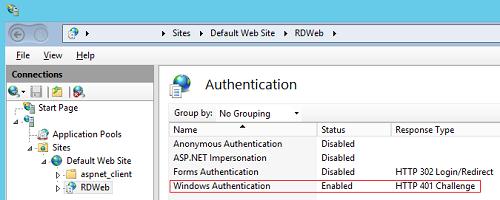 Then, on all servers with the RD Web Access role, enable Windows Authentication for the IIS RDWeb directory and disable Anonymous Authentication.