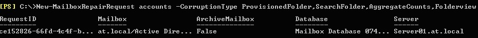 New-MailboxRepairRequest -Mailbox -CorruptionType <MailboxStoreCorruptionType[]> [-Archive ] [-Confirm []] [-DetectOnly ] [-DomainController ] [-WhatIf []]Cmdlet allows you to find and fix the following corruption types in Exchange mailboxes: