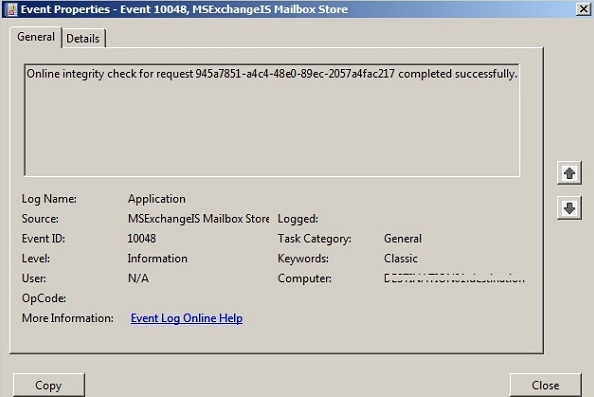New-MailboxRepairRequest -Database “NYMailBase1” -CorruptionType ProvisionedFolder, SearchFolder, AggregateCounts, FolderviewThe command runs in background mode and its results are not displayed in the PowerShell console. You can trace it by the taskID (RequestID) or / and with the help of Windows event log (event source: MSExchangeIS Mailbox Store; EventID 10059 – repair request start; EventID 10048 successful completion of the repair request).