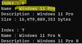 In this example, we will only export a Windows 11 Pro Edition WIM file from the ESD image (its index is 6, so we will specify /SourceIndex:6 in the next command):