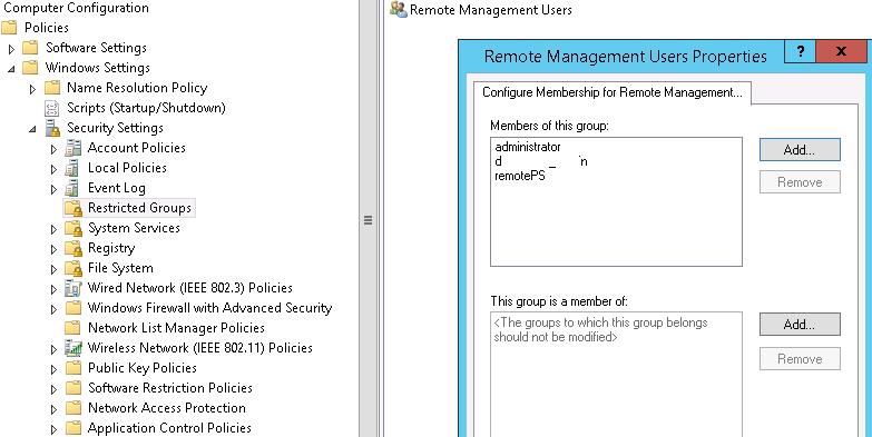 If you need to provide such permissions on multiple computers, you can use Group Policy. To do this, assign the GPO to the computers you need, and add the new Remote Management Users group to the Computer Configuration -> Windows Settings -> Security Settings -> Restricted Groups policy. Add to the policy users or groups that need to be granted access to WinRM.