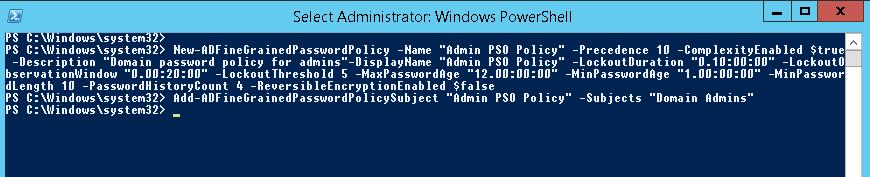 New-ADFineGrainedPasswordPolicy -Name “Admin PSO Policy” -Precedence 10 -ComplexityEnabled $true -Description “Domain password policy for admins”-DisplayName “Admin PSO Policy” -LockoutDuration “0.20:00:00” -LockoutObservationWindow “0.00:30:00” -LockoutThreshold 6 -MaxPasswordAge “12.00:00:00” -MinPasswordAge “1.00:00:00” -MinPasswordLength 8 -PasswordHistoryCount 12 -ReversibleEncryptionEnabled $false