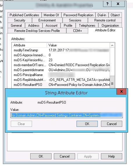 Find the msDS-ResultantPSO user attribute. This attribute shows the password policy enabled for a user (CN=Password Policy for Domain Admin,CN=Password Settings Container,CN=System,DC=woshub,DC=com).