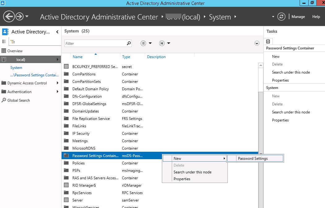 Start the Active Directory Administrative Center (dsac.msc), switch to the tree view and expand the System container. Find the Password Settings Container, right-click it, and select New -> Password Settings.