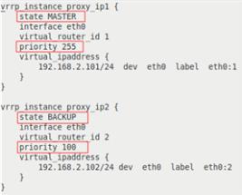 Thus, our configuration defines two VRRP instances, proxy_ip1 and proxy_ip2. At the regular operation, proxy-serv01 will be the MASTER for the virtual IP 192.168.2.101 and the BACKUP for 192.168.2.102, and vice versa, proxy-serv02 will be the MASTER for the virtual IP 192.168.2.102, and the BACKUP for 192.168.2.101.