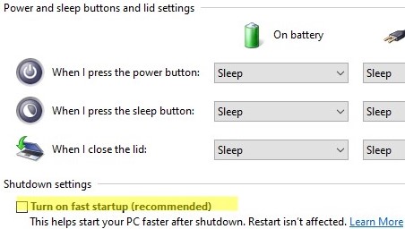 powercfg.cpl-> Choose what the power buttons do -> Change settings that are currently unavailable, disable the option Turn on fast startup (recommended); - Open the Local Group Policy Editor console (