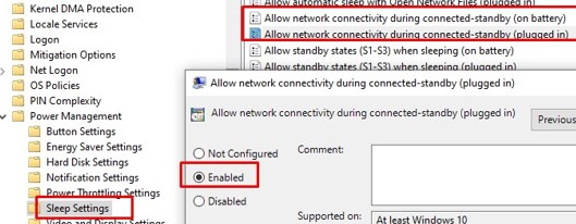 gpedit.msc) and navigate to Computer Configuration -> Administrative Templates -> System -> Power Management -> Sleep Settings. Enable the following GPO options:Allow network connectivity during connected-standby (plugged in) Allow network connectivity during connected-standby (on battery)