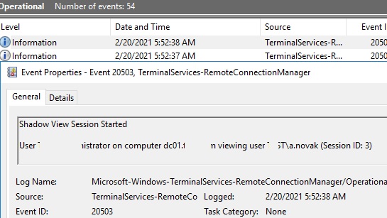 If you need to audit RDS shadow connection events for user sessions, use the following filtered events from the Microsoft-Windows-TerminalServices-RemoteConnectionManager/Operational log:
