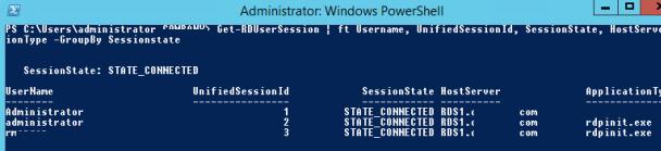 Get-RDUserSession | ft Username, UnifiedSessionId, SessionState, HostServer, ApplicationType -GroupBy Sessionstate