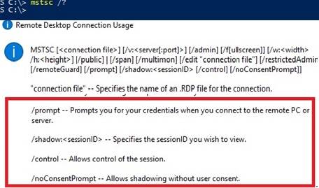 Mstsc.exe [/shadow:sessionID [/v:Servername] [/control] [/noConsentPrompt] [/prompt]]