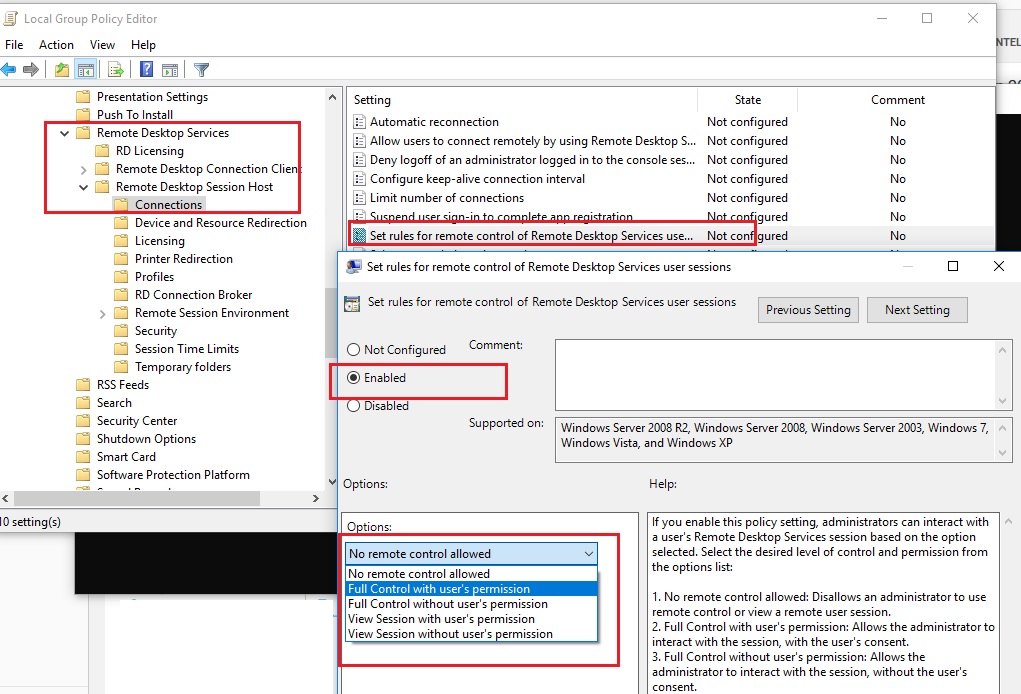 The settings for remote connections to RDS user sessions are configured using the Group Policy parameter Set rules for remote control of Remote Desktop Services user sessions, which is located under the User and Computer sections of the GPO: Policies -> Administrative Templates -> Windows components -> Remote Desktop Services -> Remote Session Host -> Connections. This policy corresponds to the DWORD Shadow parameter under the registry key HKLM\SOFTWARE\Policies\Microsoft\Windows NT\Terminal Services (the values of this parameter corresponding to the policy settings are specified in brackets).