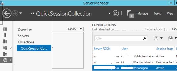 You can connect to a user session using mstsc.exe or directly from Server Manager graphical console. To do it, open the Server Manager console on the RDS server, go to the Remote Desktop Services section -> select your collection, for example QuickSessionCollection.