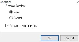 A window with Shadow connection parameters will appear. You can either View or Control a user’s RDP session. You can also check Prompt for user consent option.