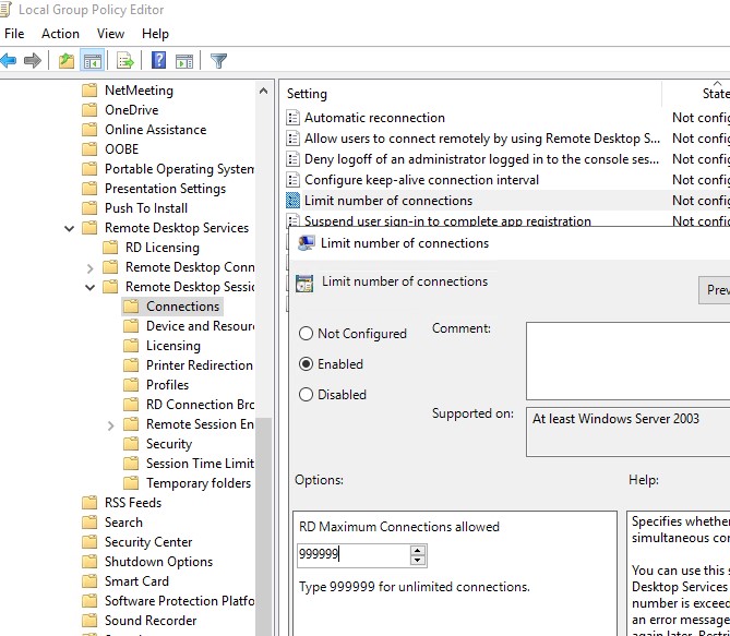 In this case, you can use the local Group Policy Editor (gpedit.msc) to enable the “Limit number of connections” option under Computer Configuration -> Administrative Templates -> Windows Components -> Remote Desktop Services -> Remote Desktop Session Host -> Connections section. Increase the ‘RD maximum connection allowed’ value to 999999.