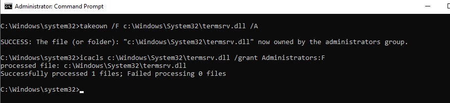 Now use the icacls.exe tool to grant Full Control permissions to the termsrv.dll file for the local Administrators group: