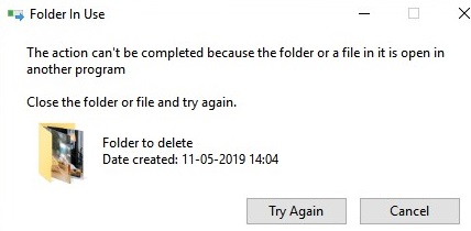Folder In Use The action can’t be completed because the folder or a file in it is open in another program. Close the file or folder and try again.