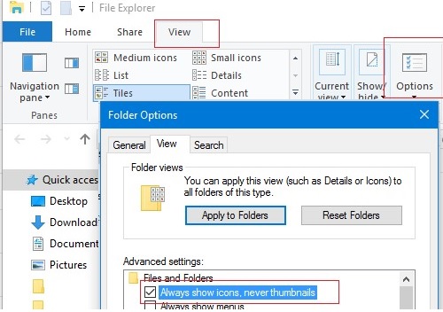 - Enable the “Always show icons, never thumbnails” option in Advanced Settings of the View tab.