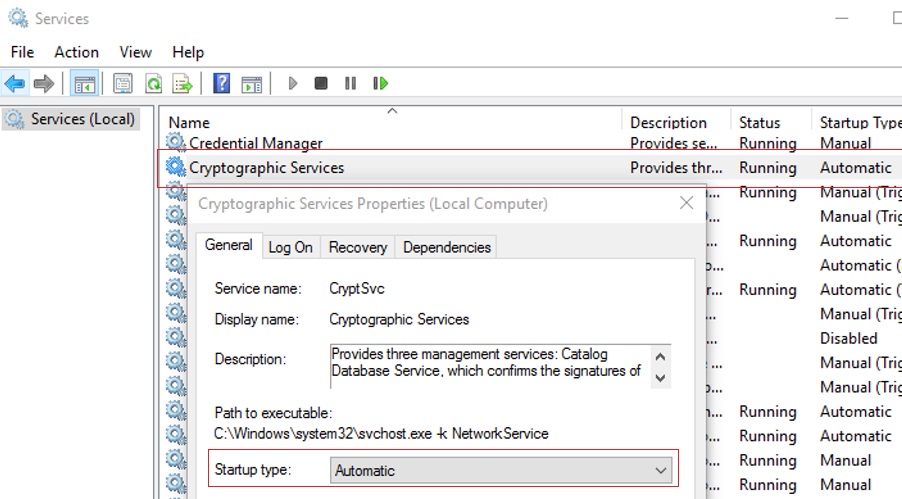 Another possible problem is errors in Cryptographic Services. Make sure the CryptSvc service is running and configured to start automatically.