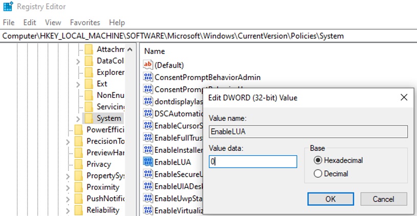 reg.exe ADD HKLM\SOFTWARE\Microsoft\Windows\CurrentVersion\Policies\System /v EnableLUA /t REG_DWORD /d 0 /f