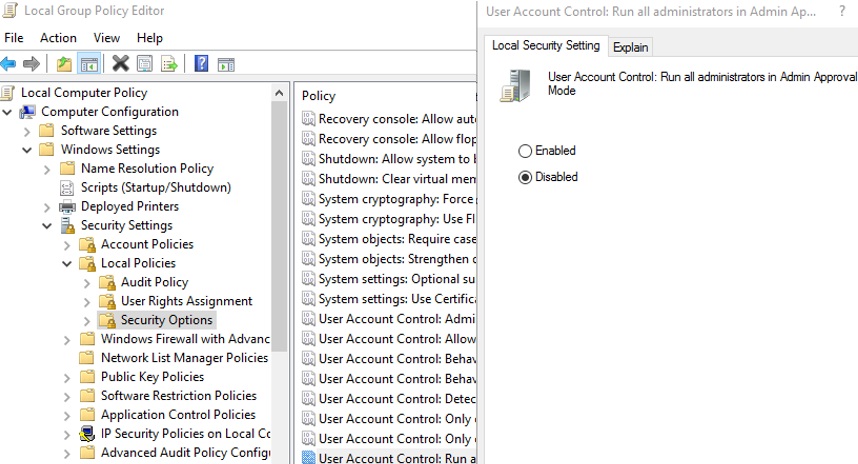 You can disable UAC through Group Policies. UAC GPO settings are located under Windows Settings -> Security Settings -> Security Options section. The names of the UAC policies start from User Account Control. Open the option “User Account Control: Run all administrators in Admin Approval Mode” and set it to Disable.